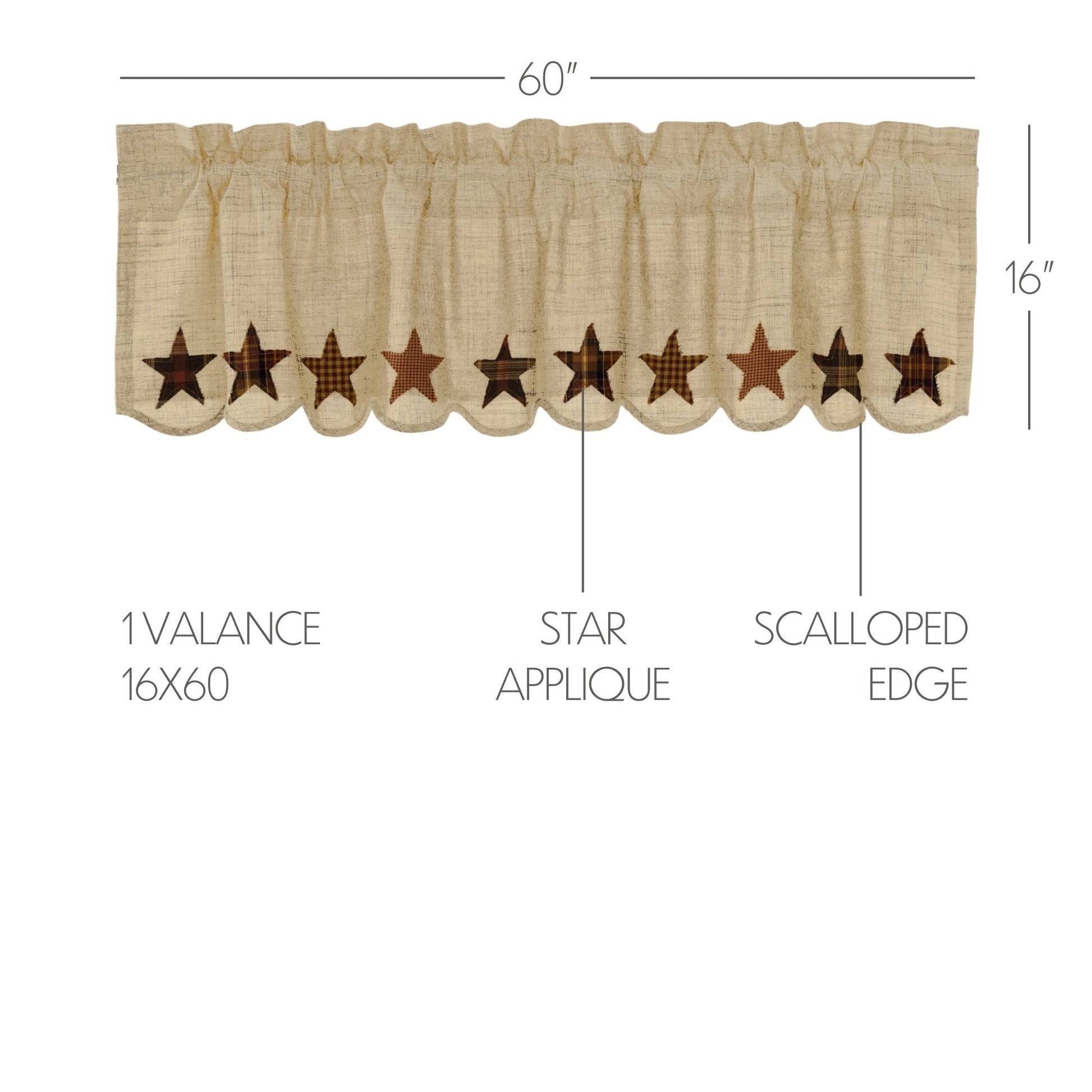 Add a cozy country accent to your windows with textured tan and gently scalloped edging. The Abilene Star Valance measures 16x60 inches and offers traditional tones of tan, burgundy, and dark brown that blend together in vintage plaid patterns. A row of applique stars complete the look. A rod pocket is included for easy hanging.