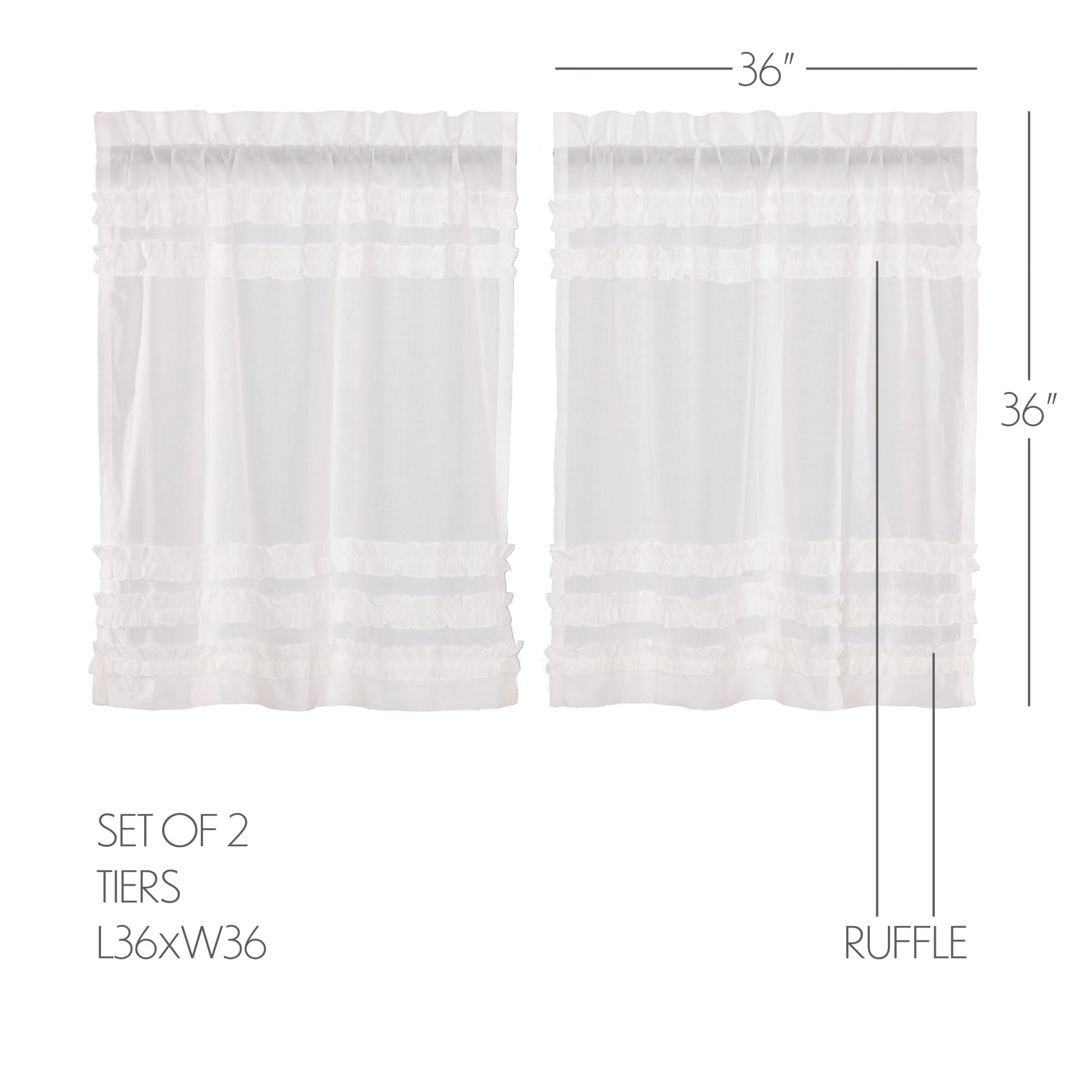 - Ruffled Tier Set - Includes two 36 by 36 inch tier curtains with a 3.25 inch rod pocket for easy installation. Tier or cafe curtains are a great way to add privacy while still allowing unfiltered sunlight to come through from above.