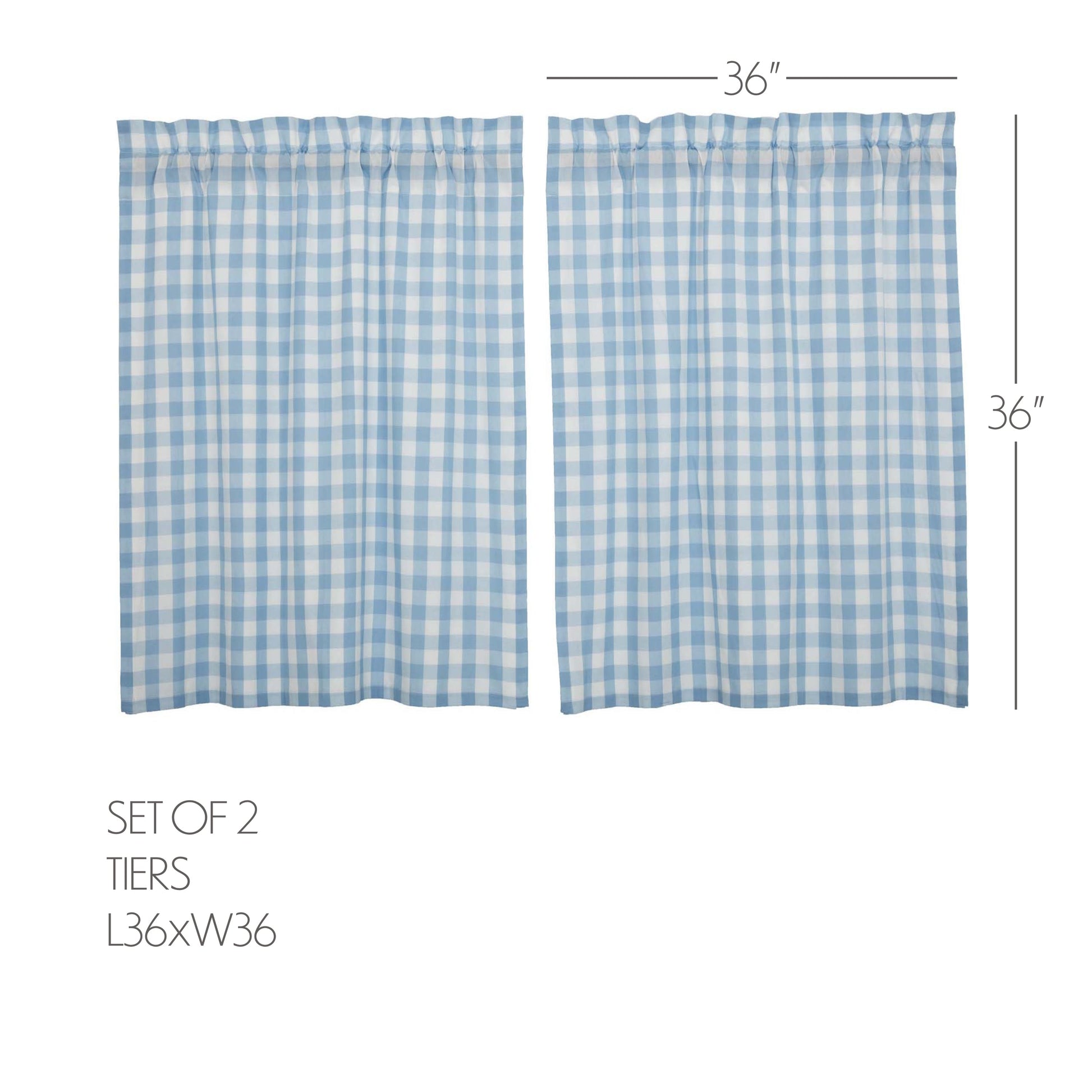 Create the perfectly charming country window of your dreams with these 36 x 36 inch tier-style curtains. Featuring light blue and white buffalo plaid, these short curtains provide just the right balance of privacy and sunshine. Pair with matching valances or prairie swag for a fully decorated look or alone for a simple pop of color and character. Also known as cafe or bistro curtains, these are a particularly good fit for decorating vintage kitchens, laundry rooms, and small bathroom windows.