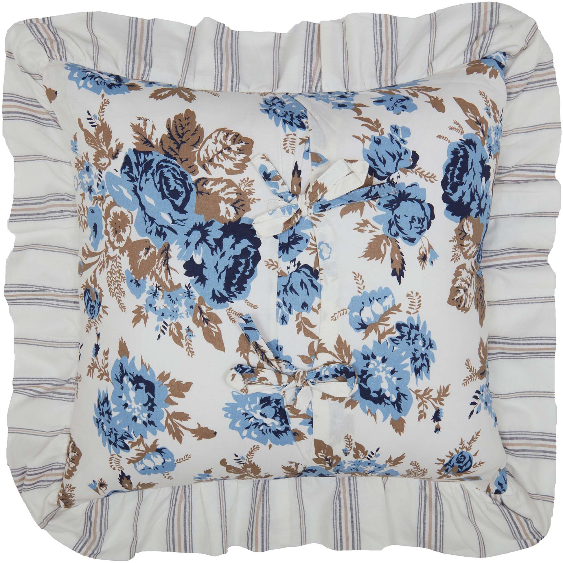 Vintage toile inspired floral in dusky blue with portabella brown accents create a beautifully feminine accent for your home. The Annie Blue Ruffled Pillow measures 18x18 inches and includes a removable cover with tie-style closures. The cotton pillowcase includes a polyester fill. Ruffled edging with soft striping adds an elegant finishing detail. Add to a sofa or soften a rocking chair with ease. Pair with other pieces from the Annie Floral Collection for a complete romantic cottage look. Machine washable and iron safe.