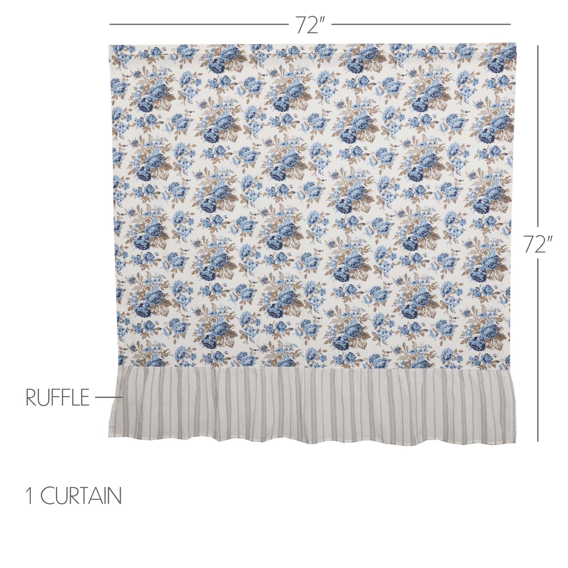 Decorate your bathroom with vintage floral and soft ruffles with the Annie Blue Floral Ruffled Shower Curtain. Featuring vintage floral print in dusk blue, soft white, and portabella brown and beautifully accented with a striped ruffle, our 72x72 fabric shower curtain provides an elegant farmhouse touch to your decor. Easily hang using your choice of the three inch rod pocket or built in buttonholes using shower hooks of your choosing (not included). Machine washable for easy care.