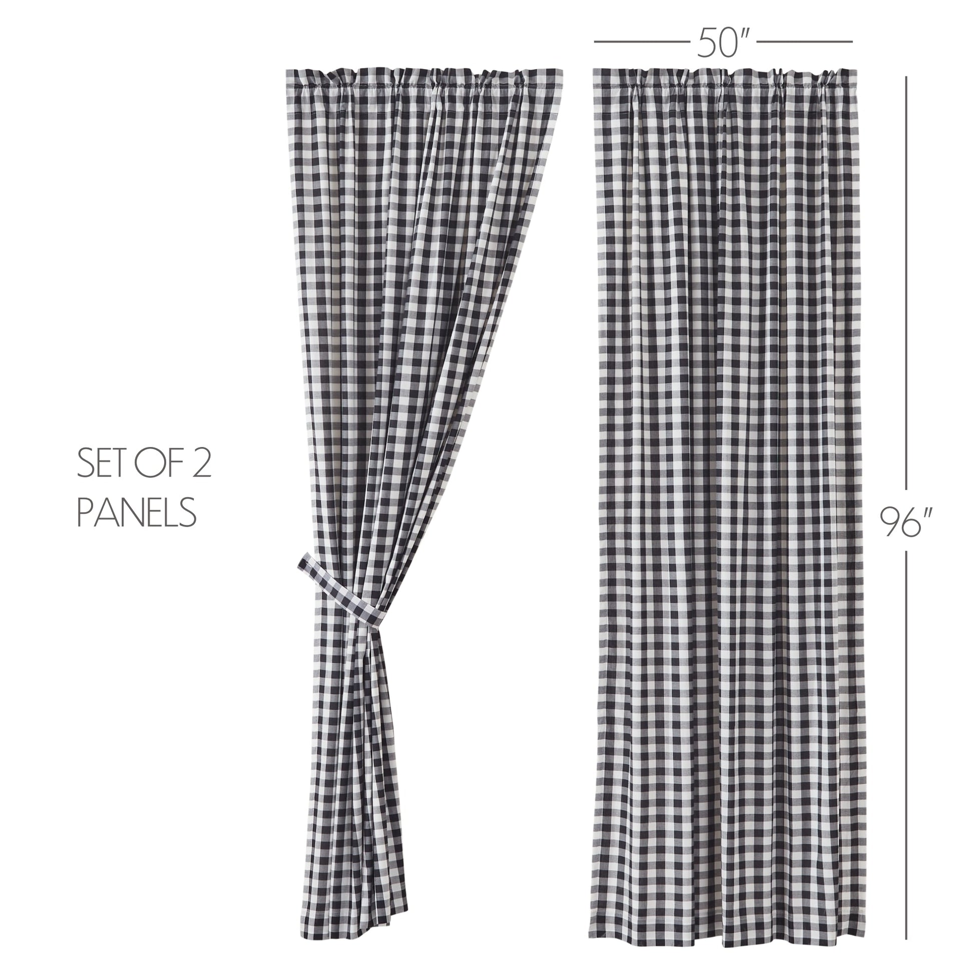 - Buffalo Check Panel - Includes two 96 by 50 inch 100% cotton window panels with a 2-inch header and a 3.25-inch rod pocket. Includes two matching tiebacks.