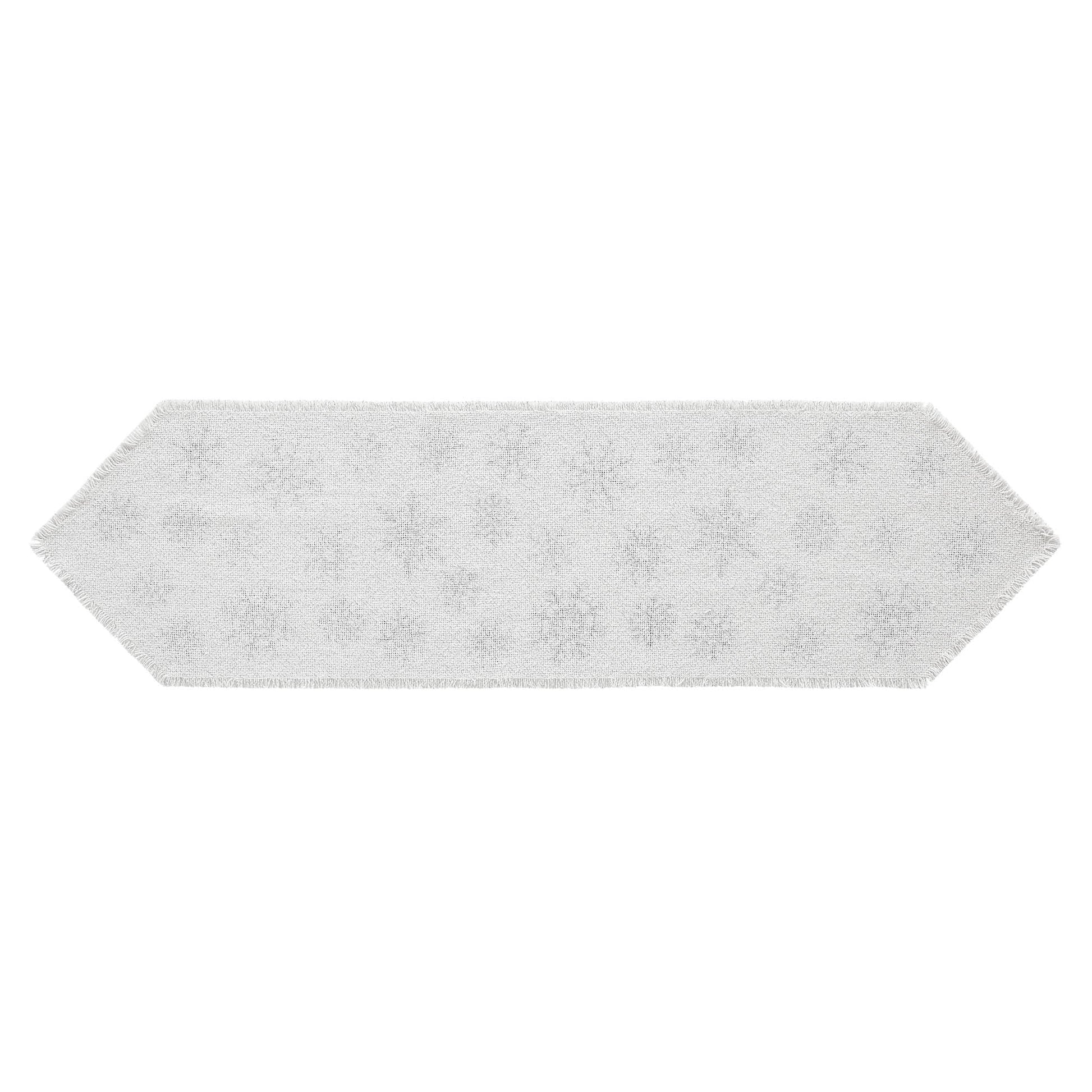 - Snowflake Table Runner - Includes one 12x48 inch holiday table runner constructed with a cotton burlap with metallic accents. Features a unique hexagonal shape.