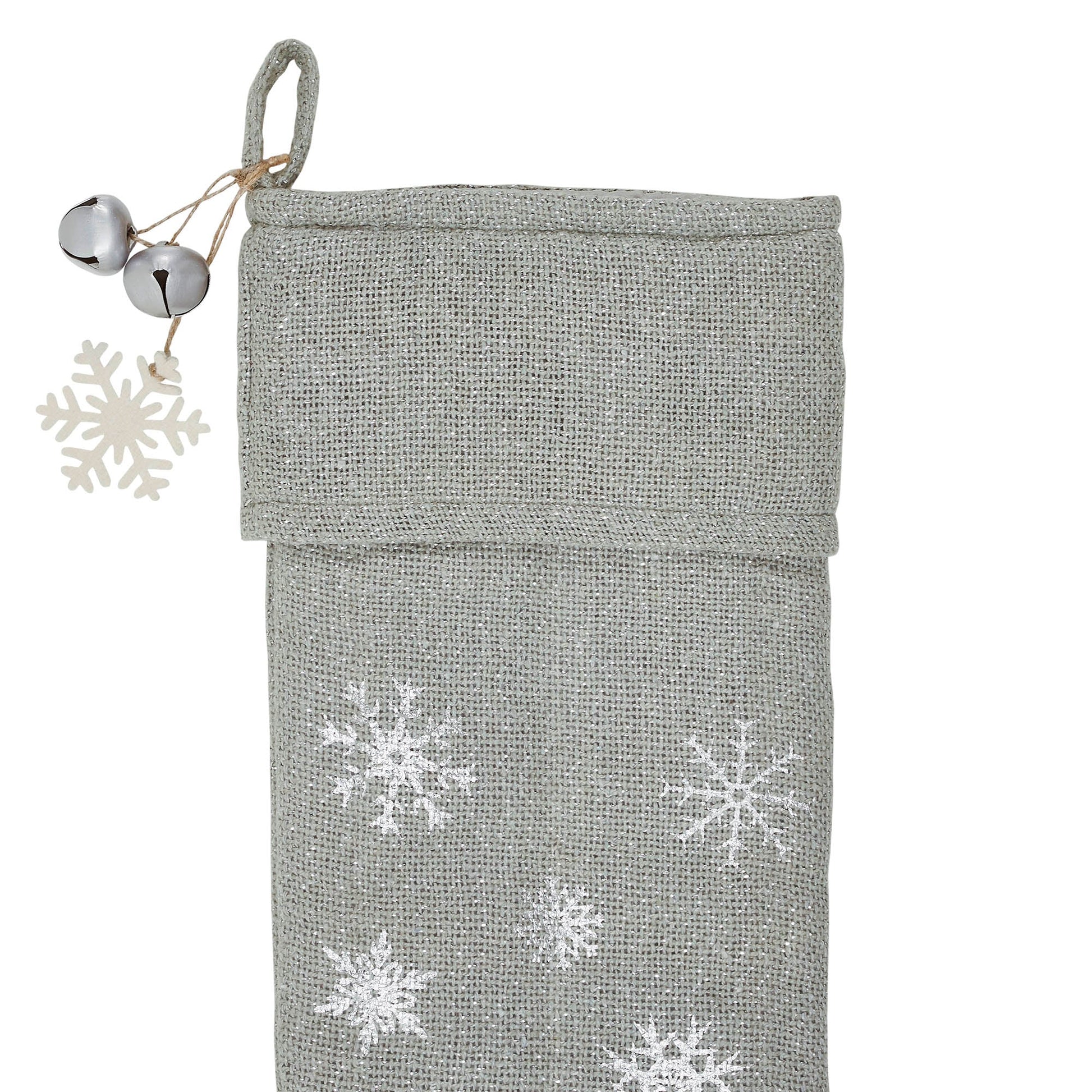 - Snowflake Design - A sea of snowflakes in a silver foil print pairs perfectly with flecks of silver for a glittering dove grey piece. Body of the grey Christmas stocking features channel quilting for added style and durability.