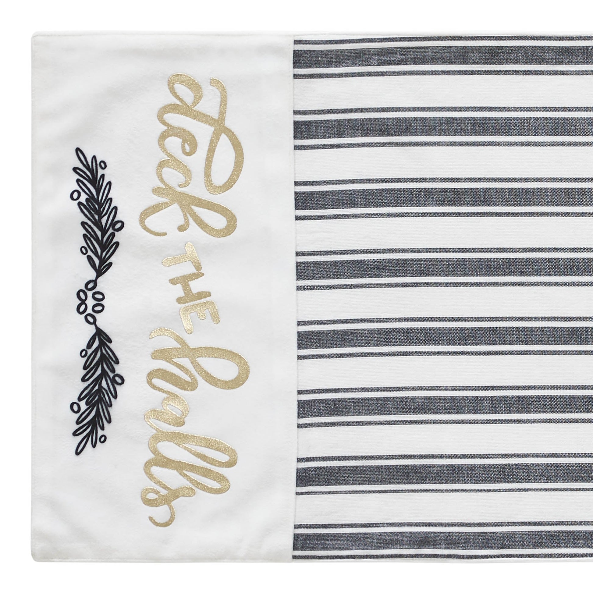 Craft a bold and festive table this season with an elegant black and white holiday table runner with gold foil accents. The Wintergleam Table Runner measures 12x48 inches and is made with 100 percent cotton. A simple grainsack stripe forms the center of the runner with accents on each end featuring a traditional holly berry print below gold foil lettering reading, Deck the Halls. Coordinates with the Wintergleam Collection by VHC for bold and elegant Christmas style for the entire home.