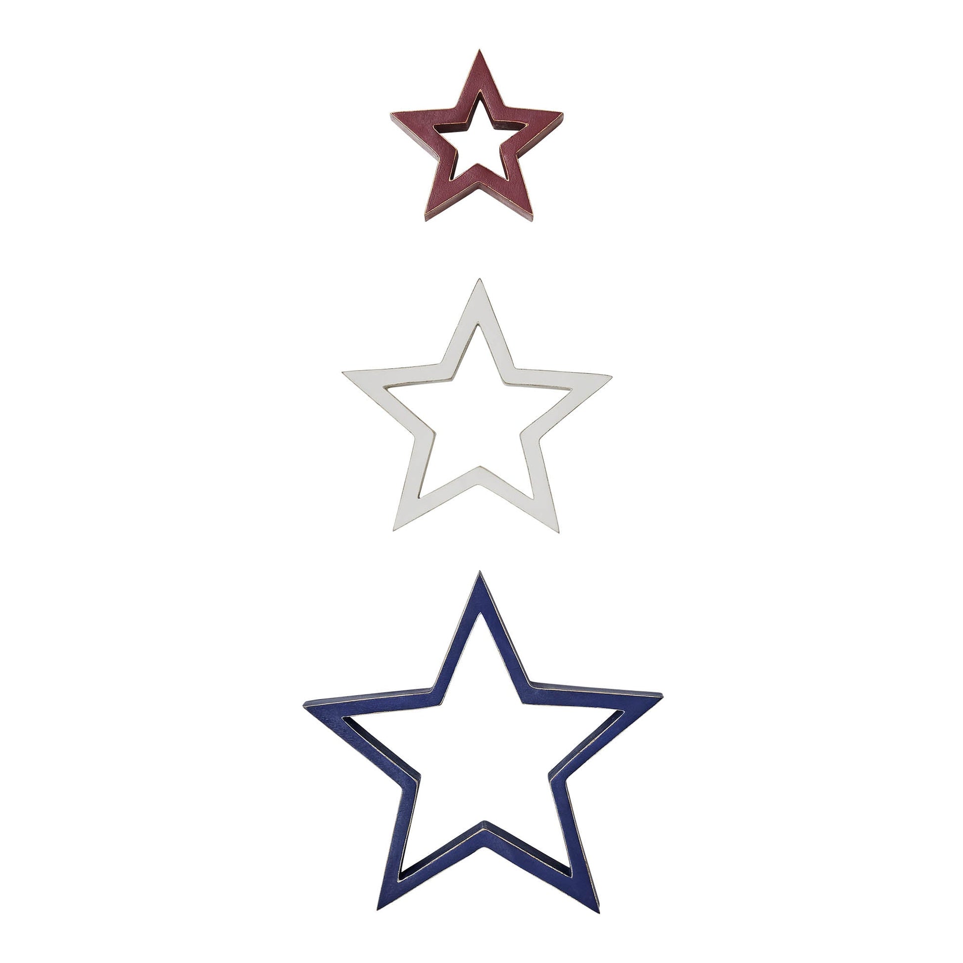 Elevate your Independence Day Decor with the Patriotic Wooden Nested Stars White 3-in-1 set. This charming ornament ensemble consists of three stars that nest inside each other, collectively measuring 10x10x1.5 inches. Crafted from high-quality tropical wood, each star features a distinctive distressed appearance, adding rustic elegance to your decor. Ideal for various spaces such as the bathroom, bedroom, dining room, entry, kitchen, and living room, these stars showcase a delightful star design, embodying the spirit of Americana.Designed to evoke a sense of country charm, these wooden stars come in faded blue, soft white, and burgundy hues, blending seamlessly with your patriotic theme. The distressed finish enhances their rustic appeal, making them a perfect addition to your Independence Day celebrations. Whether displayed individually or nested together, these stars create a visually captivating focal point that captures the essence of Independence Day in a stylish and distinctive manner.Make a bold statement with the Patriotic Wooden Nested Stars RWB 3-in-1 ornament set. Featuring three stars that nest inside each other, these charming ornaments collectively measure 10x10x1.5 inches. Crafted from tropical wood with a distressed appearance, the stars bring a touch of Americana to your home decor. With faded blue, soft white, and burgundy hues, along with a distressed finish, these stars add rustic charm to spaces like the bathroom, bedroom, dining room, entry, kitchen, or living room. Celebrate Independence Day in style with this unique and eye-catching ornament set.